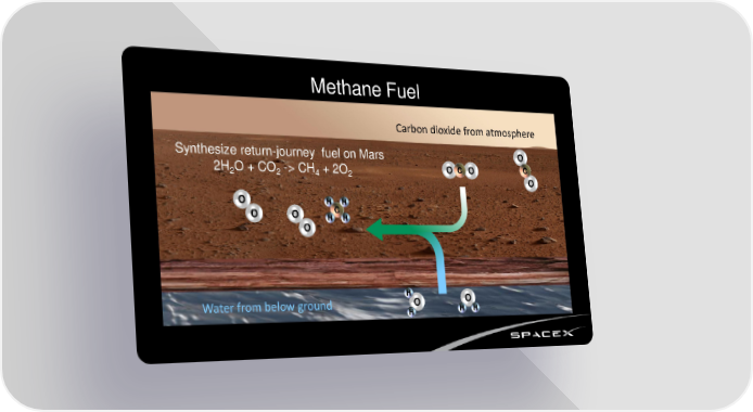 Methane Fuel Carbon dioxide from atmosphere Synthesize return-journey fuel on Mars O 2H O + CO -> CH + 2O O C O C 2 2 4 2 O O H C H O O H H O Water from below ground H O O H H H