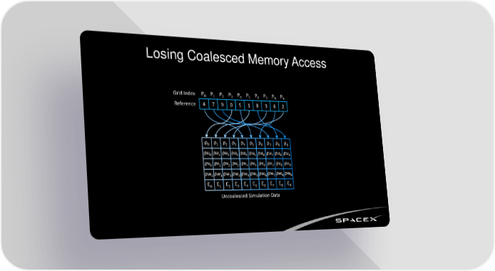Losing Coalesced Memory Access Grid Index P0 P1 P2 P3 P4 P5 P6 P7 P8 P9 Reference 4 7 9 0 5 1 8 3 6 2 ρ0 ρ1 ρ2 ρ3 ρ4 ρ5 ρ6 ρ7 ρ8 ρ9 ρu0 ρu1 ρu2 ρu3 ρu4 ρu5 ρu6 ρu7 ρu8 ρu9 ρv ρv ρv ρv ρv ρv ρv ρv ρv ρv 0 1 2 3 4 5 6 7 8 9 ρw ρw ρw ρw ρw ρw ρw ρw ρw ρw 0 1 2 3 4 5 6 7 8 9 E0 E1 E2 E3 E4 E5 E6 E7 E8 E9 Uncoalesced Simulation Data