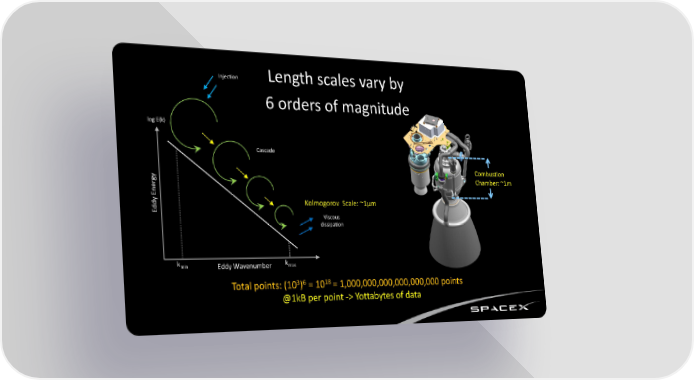 Injection Length scales vary by 6 orders of magnitude log E(k) Cascade y Combustion Chamber: ~1m Energy Edd Kolmogorov Scale: ~1µm Viscous dissipation kmin Eddy Wavenumber kmax 3 6 18 Total points: (10 ) = 10 = 1,000,000,000,000,000,000 points @1kB per point -> Yottabytes of data