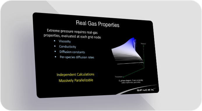 Real Gas Properties Extreme pressure requires real-gas properties, evaluated at each grid node Viscosity Pressure Conductivity Diffusion constants Per-species diffusion rates Independent Calculations Massively Parallelizable Temperature O phase diagram, Z-axis is density 2 (colour: liquid is blue, gas is white)