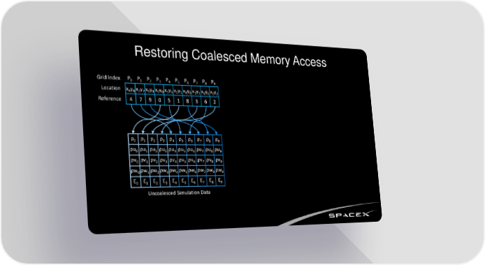 Restoring Coalesced Memory Access Grid Index P0 P1 P2 P3 P4 P5 P6 P7 P8 P9 Location x y x y x y x y x y x y x y x y x y x y 4 4 7 7 9 9 0 0 5 5 1 1 8 8 3 3 6 6 2 2 Reference 4 7 9 0 5 1 8 3 6 2 ρ0 ρ1 ρ2 ρ3 ρ4 ρ5 ρ6 ρ7 ρ8 ρ9 ρu0 ρu1 ρu2 ρu3 ρu4 ρu5 ρu6 ρu7 ρu8 ρu9 ρv ρv ρv ρv ρv ρv ρv ρv ρv ρv 0 1 2 3 4 5 6 7 8 9 ρw ρw ρw ρw ρw ρw ρw ρw ρw ρw 0 1 2 3 4 5 6 7 8 9 E0 E1 E2 E3 E4 E5 E6 E7 E8 E9 Uncoalesced Simulation Data