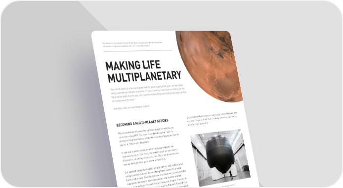 This documet is an abridged transcript of Elon Musk’s presentation at the 68th International Astronautical Congress on September 28th, 2017 in Adelaide, Australia. MAKING LIFE MULTIPLANETARY “You want to wake up in the morning and think the future is going to be great - and that’s what being a spacefaring civilization is all about. It’s about believing in the future and thinking that the future will be better than the past. And I can’t think of anything more exciting than going out there and being among the stars.” Elon Musk, CEO and Lead Designer, SpaceX BECOMING A MULTI-PLANET SPECIES good sense of what it takes to create a huge carbon fiber tank that can hold cryogenic liquid. That is actually extremely important for This presentation will cover the updated design for what we are making a light spaceship. currently calling BFR. The most important thing that I want to convey in this presentation is that I think we have figured out how to pay for it. This is very important. In last year’s presentation, we were really searching for the right way to pay for this thing. We went through various ideas— Kickstarter, collecting underpants, etc. These didn’t pan out, but now we think we have got a way to achieve this. Our updated design leverages a smaller vehicle, still pretty big but a single vehicle that can do everything that’s needed for greater Earth orbit activity. Essentially we want to make our current vehicles redundant. We want to have one system—one booster and one ship—that replaces Falcon 9, Falcon Heavy and Dragon. If we can do that, then all the resources that are used for Falcon 9, Falcon Heavy and Dragon can be applied to this system. That’s really fundamental. PROGRESS Fig.1. Deep cryo liquid oxygen tank developed by SpaceX DEEP CRYO LIQUID OXYGEN TANK RAPTOR ENGINE TESTING The next key element is on the engine side. We have to have an This giant deep cryo liquid oxygen tank is actually a twelve meter extremely efficient engine; the Raptor engine will be the highest tank—you can see the relative scale of it in figure 1. It’s a thousand thrust-to-weight engine, we believe, of any engine of any kind cubic meters of volume inside. That is actually more pressurized ever made. We already have 1200 seconds of firing across 42 main volume than an A380, to put that into perspective. We developed a engine tests. We have fired Raptor for as long as 100 seconds. It new carbon fiber matrix that is much stronger and more capable at could fire for much longer than 100 seconds, this is just a reflection cryo than anything before, and it holds 1200 tons of liquid oxygen. of the size of the test tanks. The duration of the firing for landing on We successfully tested the tank up to its design pressure and then Mars is about 40 seconds. The test engine currently operates at 200 went a little further. We wanted to see where it would break, and we atmospheres, or 200 bar, the flight engine will be at 250 bar, and succeeded in that effort. It shot about 300 feet into the air, landed then we believe over time we could probably get that to a little over in the ocean and we fished it out. At this point we have got a pretty 300 bar. abridged transcript 9/28/2017 © SpaceX 2017 spacex.com/mars 1