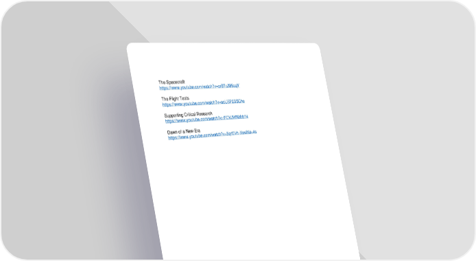 The Spacecraft https://www.youtube.com/watch?v=zrBTu389aqY The Flight Tests https://www.youtube.com/watch?v=aoU5P2SSCho Supporting Critical Research https://www.youtube.com/watch?v=FCVJWNbhb14 Dawn of a New Era https://www.youtube.com/watch?v=5qrUVh-Xev8&t=4s