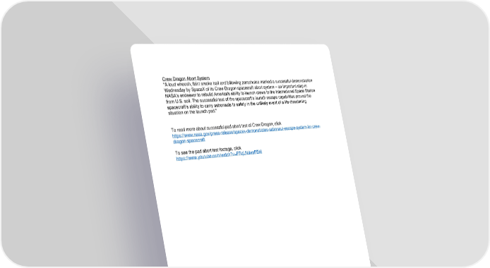 Crew Dragon Abort System "A loud whoosh, faint smoke trail and billowing parachutes marked a successful demonstration Wednesday by SpaceX of its Crew Dragon spacecraft abort system – an important step in NASA’s endeavor to rebuild America's ability to launch crews to the International Space Station from U.S. soil. The successful test of the spacecraft’s launch escape capabilities proved the spacecraft’s ability to carry astronauts to safety in the unlikely event of a life-threatening situation on the launch pad." To read more about successful pad abort test of Crew Dragon, click https://www.nasa.gov/press-release/spacex-demonstrates-astronaut-escape-system-for-crew- dragon-spacecraft To see the pad abort test footage, click https://www.youtube.com/watch?v=FRqLNdwsPBM