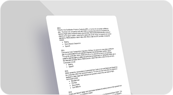 2013 Kickoff of the Certification Products Contracts (CPC), is the first of a two-phase certification plan. The three U.S. companies work with NASA to develop data products to implement the agency's flight safety and performance requirements. This includes implementation across all aspects of the space system, including the spacecraft, launch vehicle, and ground and mission operations. NASA awards a total of about $30 million under the CPC contracts. Companies include: • Boeing • Sierra Nevada Corporation • SpaceX 2014 Commercial Crew Transportation Capability (CCtCap), the second of a two-phase certification plan for commercially built and operated integrated crew transportation systems, begins. Through its certification efforts, NASA will ensure the selected commercial transportation systems meet the agency’s safety and performance requirements for transporting NASA crew to the International Space Station. NASA awards a total of $6.8 billion under CCtCap contracts. Companies include: • Boeing • SpaceX 2015 NASA names four astronauts as Commercial Crew Cadre to work with Boeing and SpaceX as the companies refine their spacecraft systems. The crew provides invaluable user experience feedback to help shape their hardware and systems to ensure they are ready for flight. Astronauts include: • Bob Behnken • Eric Boe • Doug Hurley • Suni Williams 2016 Boeing and SpaceX design and manufacture hardware for testing to ensure their spacecraft can handle the harsh environment of space. The International Docking Adapter, or IDA, is installed on the International Space Station. Two IDAs will ultimately serve as the docking points for Boeing's CST-100 Starliner and SpaceX's Crew Dragon. 2017 Boeing and SpaceX continue development and testing to prepare for emergency situations and ensure human safety. Boeing and SpaceX unveil brand-new spacesuits to be worn by crews while on board each company's spacecraft.