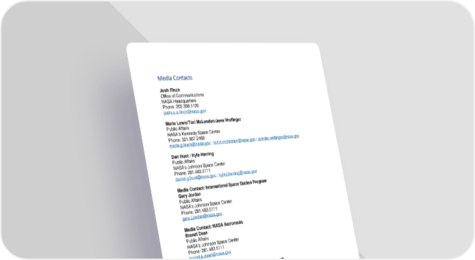 Media Contacts Josh Finch Office of Communications NASA Headquarters Phone: 202.358.1100 [email protected] Marie Lewis/Tori McLendon/Jenn Wolfinger Public Affairs NASA’s Kennedy Space Center Phone: 321.867.2468 [email protected] / [email protected] / [email protected] Dan Huot / Kyle Herring Public Affairs NASA's Johnson Space Center Phone: 281.483.5111 [email protected] / [email protected] Media Contact: International Space Station Program Gary Jordan Public Affairs NASA's Johnson Space Center Phone: 281.483.5111 [email protected] Media Contact: NASA Astronauts Brandi Dean Public Affairs NASA's Johnson Space Center Phone: 281.483.5111 [email protected] Media Contact: Boeing Rebecca Regan Josh Barrett Phone: 321.607.2297 Phone: 321.607.4118 [email protected] [email protected] Jessica Landa Phone: 321.360.9132 [email protected] Media Contact: SpaceX SpaceX Public Affairs [email protected] James Gleeson [email protected]