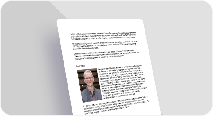 In 2014, Shotwell was appointed to the United States Export Import Bank's Advisory Committee and the Federal Aviation Administration’s Management Advisory Council. Shotwell was elected to the honorable grade of Fellow with the American Institute of Aeronautics and Astronautics. Through leadership in both corporate and external science, technology, engineering and math (STEM) programs, Shotwell has helped raise over $1.4 million for STEM programs reaching thousands of students nationwide. Shotwell received, with honors, her bachelor’s and master’s degrees from Northwestern University in mechanical engineering and applied mathematics, and serves on their board. She has authored dozens of papers on a variety of space-related subjects. Benji Reed Benjamin “Benji” Reed is the director of Crew Mission Management at SpaceX. In this role he is helping spearhead the company’s development and certification efforts for the Crew Transportation System, including the Dragon spacecraft, Falcon 9 rocket, ground systems and operations. Prior to this position, Benji was a mission manager for Dragon cargo missions to the International Space Station, including the CRS-3 mission, which carried the first science payloads in the Dragon trunk. Over the past 20 years, he has been a leader in various commercial aerospace and NASA programs, including hardware development serving the Hubble Space Telescope, space station and planetary science missions. He spent many years as the co-owner of a software and Internet development firm and also has been a teacher. A native of Boulder, Colorado, Benji graduated from the University of Colorado with a degree in mathematics, working at the Center for Astrophysics and Space Astronomy on programs, including the Far Ultraviolet Spectrographic Explorer and the Cosmic Origins Spectrograph. He lives in Los Angeles, California, with his wife and three children.