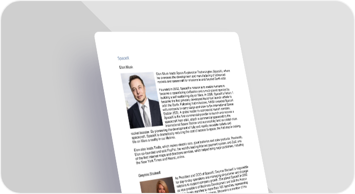 SpaceX Elon Musk Elon Musk leads Space Exploration Technologies (SpaceX), where he oversees the development and manufacturing of advanced rockets and spacecraft for missions to and beyond Earth orbit. Founded in 2002, SpaceX’s mission is to enable humans to become a spacefaring civilization and a multi-planet species by building a self-sustaining city on Mars. In 2008, SpaceX’s Falcon 1 became the first privately developed liquid-fuel launch vehicle to orbit the Earth. Following that milestone, NASA awarded SpaceX with contracts to carry cargo and crew to the International Space Station (ISS). A global leader in commercial launch services, SpaceX is the first commercial provider to launch and recover a spacecraft from orbit, attach a commercial spacecraft to the International Space Station and successfully land an orbital-class rocket booster. By pioneering the development of fully and rapidly reusable rockets and spacecraft, SpaceX is dramatically reducing the cost of access to space, the first step in making life on Mars a reality in our lifetime. Elon also leads Tesla, which makes electric cars, giant batteries and solar products. Previously, Elon co-founded and sold PayPal, the world's leading Internet payment system, and Zip2, one of the first internet maps and directions services, which helped bring major publishers, including the New York Times and Hearst, online. Gwynne Shotwell As President and COO of SpaceX, Gwynne Shotwell is responsible for day-to-day operations and managing all customer and strategic relations to support company growth. She joined SpaceX in 2002 as vice president of Business Development and built the Falcon vehicle family manifest to more than 100 launches, representing more than $10 billion in business. Shotwell is a member of the SpaceX Board of Directors. Prior to joining SpaceX, Shotwell spent more than 10 years at the Aerospace Corporation, holding positions in space systems engineering, technology and project management. She was promoted to the role of chief engineer of an MLV-class satellite program, managed a landmark study for the Federal Aviation Administration on commercial space transportation, and completed an extensive analysis of space policy for NASA’s future investment in space transportation. In addition to being named the 2018 Satellite Executive of the Year, Shotwell was awarded the AIAA Goddard Astronautics Awards as well as the American Society of Mechanical Engineers Ralph Coats Roe Medal. Fortune Magazine placed Shotwell at No. 42 on its list of the World’s 50 Greatest Leaders in 2018 and Forbes named her No. 70 on its list of Power Women in 2017.