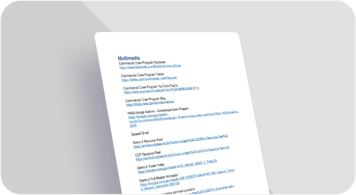 Multimedia Commercial Crew Program Facebook https://www.facebook.com/NASACommercialCrew Commercial Crew Program Twitter https://twitter.com/commercial_crew?lang=en Commercial Crew Program YouTube Playlist https://www.youtube.com/playlist?list=PLBE9B5BD2A8B10113 Commercial Crew Program Blog https://blogs.nasa.gov/commercialcrew NASA Image Archive - Commercial Crew Program https://images.nasa.gov/search- results?q=commercial%20crew&page=1&media=image,video,audio&yearStart=1920&yearEnd= 2018 SpaceX B-roll Demo-2 Resource Reel https://archive.org/search.php?query=subject%3A%22DM-2+Resource+Reel%22 CCP Resource Reel https://archive.org/search.php?query=subject%3A%22CCP+Resource+Reel%22 Demo-2 Trailer Video https://images.nasa.gov/details-NHQ_050420_DEMO_2_TRAILER Demo-2 Full Mission Animation https://images.nasa.gov/details-KSC-20200513-MH-SPX01-0001-SpaceX_Demo- 2_Mission_Animation-3250103 Doug Hurley answering common questions https://archive.org/search.php?query=subject%3A%22DM-2+Crew+Interview+- +Doug+Hurley%22 Doug Hurley media interviews on NASA TV https://archive.org/details/iss063m261221939- NASA_SpaceX_Demo2_Douglas_Hurley_Interviews_2020_0501 Bob Behnken answering common questions https://archive.org/search.php?query=subject%3A%22DM-2+Crew+Interview+- +Bob+Behnken%22 Bob Behnken media interview on NASA TV https://archive.org/details/NASA_SpaceX_Demo2_Robert_Behnken_Interviews_2020_0501