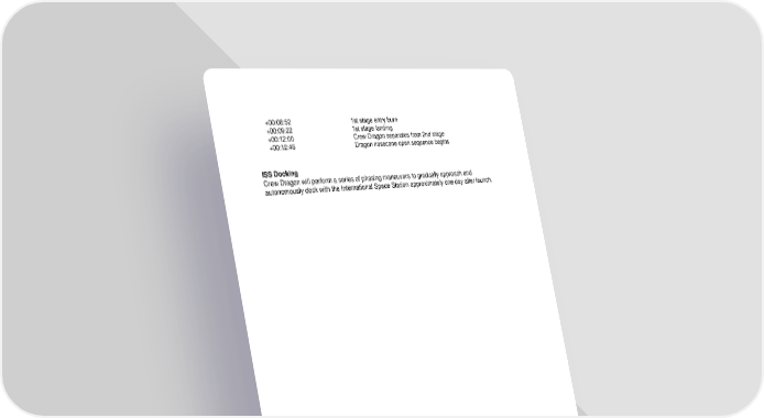 +00:08:52 1st stage entry burn +00:09:22 1st stage landing +00:12:00 Crew Dragon separates from 2nd stage +00:12:46 Dragon nosecone open sequence begins ISS Docking Crew Dragon will perform a series of phasing maneuvers to gradually approach and autonomously dock with the International Space Station approximately one day after launch.