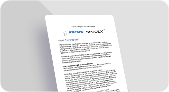 Working side-by-side with our two partners: What is Commercial Crew? NASA’s Commercial Crew Program is working with the American aerospace industry as companies develop and operate a new generation of spacecraft and launch systems capable of carrying crews to low-Earth orbit and the International Space Station. Commercial transportation to and from the station will provide expanded utility, additional research time and broader opportunities for discovery on the orbiting laboratory. The station is a critical testbed for NASA to understand and overcome the challenges of long- duration spaceflight. As commercial companies focus on providing human transportation services to and from low-Earth orbit, NASA is freed up to focus on building spacecraft and rockets for deep space missions. How is the Commercial Crew Program Different? The Commercial Crew Program represents a revolutionary approach to government and commercial collaborations for the advancement of space exploration. NASA's Prior Approach for Obtaining Crew Transportation Systems Since the Mercury program in the early 1960s, NASA has used an almost identical operating model to achieve its goals of human spaceflight. This includes the Space Shuttle Program and the American portions of the International Space Station. NASA would identify a need for a crew transportation system and then the agency's engineers and specialists would oversee every development aspect of the spacecraft, support systems and operations plans. A commercial aerospace contractor would be chosen to build the system, ensuring that it meets the specifications spelled out by NASA. Personnel from NASA would be heavily involved and oversee the processing, testing, launching and operation of the crew system to ensure safety and reliability. All of the hardware and infrastructure would be owned by NASA. Commercial Crew's Approach for Obtaining Crew Transportation Systems NASA identified a need for a crew transportation system and a broad set of requirements that would be necessary to ensure crew safety. In the case of commercial crew, the need centered around a safe, reliable and cost-effective means of getting humans to low-Earth orbit, including the International Space Station, and return safely to Earth. Interested companies are free to design in a way they think is best and are encouraged to apply their most efficient and effective manufacturing and business operating techniques. The companies own and operate their hardware and infrastructure. NASA's engineers and aerospace specialists work closely with the commercial companies, allowing for substantial insight into the development process and offering up expertise and available resources. The Commercial Crew Program is the first time this model has been implemented. For more, click here: https://www.nasa.gov/content/commercial-crew-program-the-essentials/.