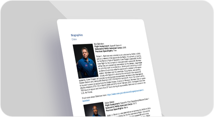 Biographies Crew Bob Behnken Flight Assignment: SpaceX Demo-2 Selected to NASA Astronaut Corps: 2000 Previous Spaceflights: Two Robert L. Behnken was selected as an astronaut by NASA in 2000 and is a veteran of two space shuttle flights. He currently is training for the Demo-2 flight of SpaceX’s Crew Dragon spacecraft, the first crew flight for the company's next-generation spacecraft. Behnken will be the joint operations commander for the mission, responsible for activities such as rendezvous, docking and undocking, as well as Demo-2 activities while the spacecraft is docked to the space station. Behnken and his crewmate, Doug Hurley, are working closely with SpaceX to develop the company's new spacecraft systems. Crew Dragon will provide round-trip crew transportation services to the International Space Station and, along with Boeing’s CST-100 Starliner spacecraft, return the nation's ability to launch humans to space from the United States. A native of Missouri, Behnken flew on space shuttle missions STS-123 in March 2008 and STS-130 in February 2010. He logged more than 708 hours in space and more than 37 hours during six spacewalks. Behnken is a colonel in the U.S. Air Force. Find more about Behnken here: https://www.nasa.gov/astronauts/biographies/robert-l- behnken Victor Glover Flight Assignment: SpaceX's First Operational Mission/Crew-1 Selected to NASA Astronaut Corps: 2013 Previous Spaceflights: None Victor J. Glover Jr. was selected as an astronaut by NASA in 2013. He currently is training for the first operational flight—the second crew flight—for SpaceX’s Crew Dragon spacecraft and a long- duration mission aboard the International Space Station. Glover and his crewmates, Mike Hopkins, Soichi Noguchi and Shannon Walker, are working closely with SpaceX on their new spacecraft systems. Crew Dragon will provide round-trip crew transportation services to the International Space Station and, along with Boeing's CST-100 Starliner spacecraft, return the nation's ability to launch humans to low-Earth orbit from the United States. The California native holds a Bachelor of Science in general engineering, a Master of Science in flight test engineering, a Master of Science in systems engineering and a Master of Military Operational Art and Science. Glover, a U.S. Navy commander, is a naval aviator and was a test pilot in the F/A‐18 Hornet, Super Hornet and EA‐18G Growler. Find more about Glover here: https://www.nasa.gov/astronauts/biographies/victor-j-glover