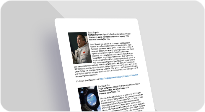 Soichi Noguchi Flight Assignment: SpaceX's First Operational Mission/Crew-1 Selected to Japan Aerospace Exploration Agency: 1996 Previous Spaceflights: Two Soichi Noguchi was selected as an astronaut candidate by the National Space Development Agency of Japan (currently, Japan Aerospace Exploration Agency, JAXA) in 1996 and is a veteran of two space missions. He currently is training for the first operational flight—the second crew flight—for SpaceX’s Crew Dragon spacecraft and a long-duration mission aboard the International Space Station. Noguichi and his crewmates, Victor Glover, Mike Hopkins and Shannon Walker, are working closely with SpaceX on their new spacecraft systems. Crew Dragon will provide round-trip crew transportation services to the International Space Station and, along with Boeing’s CST- 100 Starliner spacecraft, return the nation's ability to launch humans to low-Earth orbit from the United States. The Japanese native was a member of the STS-114 and Expedition 22/23 crews, was the first Japanese astronaut to performs EVAs on the space station and has logged over 20 hours during three spacewalks. Find more about Noguchi here: https://iss.jaxa.jp/en/astro/biographies/noguchi/index.html Shannon Walker Flight Assignment: SpaceX First Operational Mission/Crew-1 Selected to NASA Astronaut Corps: 2004 Previous Spaceflights: One Shannon Walker was selected as an astronaut by NASA in 2004 and is a veteran of two spaceflights. She currently is training for the first operational flight—the second crew flight—for SpaceX’s Crew Dragon spacecraft and a long-duration mission aboard the International Space Station. Walker and her crewmates, Victor Glover, Mike Hopkins and Soichi Noguchi, are working closely with SpaceX on their new spacecraft systems. Crew Dragon will provide round-trip crew transportation services to the International Space Station and, along with Boeing’s Starliner, return the ability to launch humans into low-Earth orbit from the United States. A native of Houston, TX, Walker served as a crew member for Expeditions 24 and 25 and is one of only 35 people to be both astronauts and aquanauts, having commanded the NASA Extreme Environments Mission Operations (NEEMO) 15 mission. She has logged more than 160 days in space. Walker holds several degrees including a Doctorate of Philosophy in Space Physics. Find more about Walker here: https://www.nasa.gov/astronauts/biographies/walker- shannon