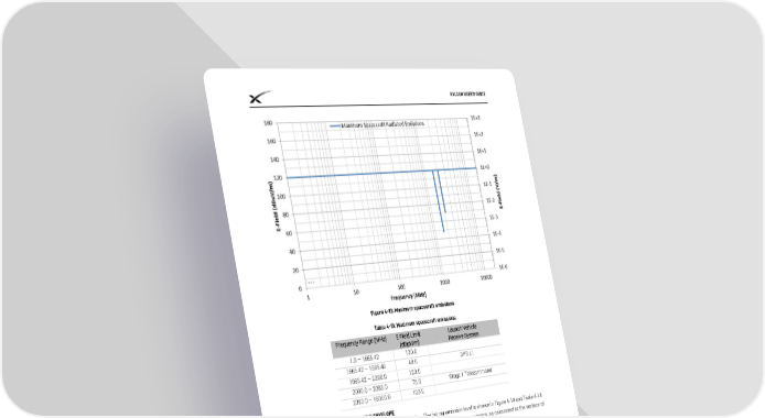 FALCON USER’S GUIDE Figure 4-13: Maximum spacecraft emissions Table 4-13: Maximum spacecraft emissions Frequency Range (MHz) E Field Limit Launch Vehicle (dBμV/m) Receive System 1.0 – 1565.42 120.0 1565.42 – 1585.42 48.0 GPS L1 1585.42 – 2090.0 120.0 2090.0 – 2093.0 70.0 Stage 1 Telecommand 2093.0 – 18000.0 120.0 4.3.6.4 FAIRING EMISSIONS ENVELOPE Falcon launch vehicles have avionics inside the fairing. The fairing emission level is shown in Figure 4-14 and Table 4-14. This limit envelopes the maximum expected combined emissions from these avionics, as calculated at the surface of the payload volume in Figure 5-1. EMI safety margin is not included. © Space Exploration Technologies Corp. All rights reserved. 31