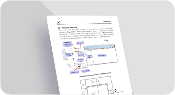 FALCON USER’S GUIDE SPACECRAFT PROCESSING SpaceX provides an ISO Class 8 (Class 100,000) PPF for processing customer spacecraft, including equipment unloading, unpacking/packing, final assembly, nonhazardous flight preparations, and payload checkout. The payload processing facility is available to customers from four weeks prior to launch, with 16 hours per day standard availability and access during that period. Additional time in the payload processing facility may be available as a nonstandard service. The PPF layouts for VAFB and CCAFS are shown in Figure 8-2, Figure 8-3, and Figure 8-4 respectively. Figure 8-2: VAFB payload processing facility and integration hangar layout Figure 8-3: CCAFS PPF East Bay floor plan © Space Exploration Technologies Corp. All rights reserved. 53