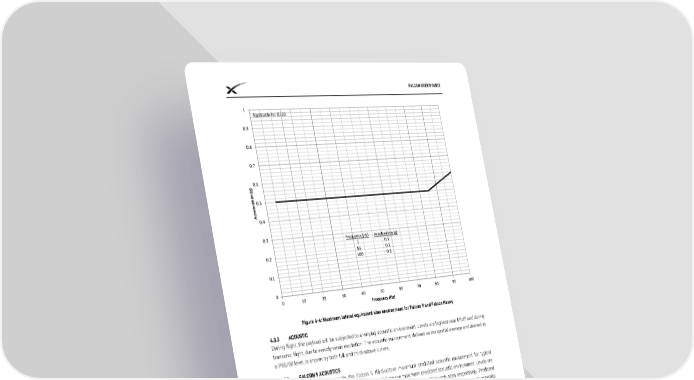 FALCON USER’S GUIDE 1 Applicable for Q≥20 0.9 0.8 0.7 g)0.6 ( n io t0.5 ra le e c c A0.4 0.3 Frequency (Hz) Acceleration (g) 5 0.5 0.2 85 0.5 100 0.6 0.1 0 0 10 20 30 40 50 60 70 80 90 100 Frequency (Hz) Figure 4-4: Maximum lateral equivalent sine environment for Falcon 9 and Falcon Heavy 4.3.3 ACOUSTIC During flight, the payload will be subjected to a varying acoustic environment. Levels are highest near liftoff and during transonic flight, due to aerodynamic excitation. The acoustic environment, defined as the spatial average and derived at a P95/50 level, is shown by both full and third-octave curves. 4.3.3.1 FALCON 9 ACOUSTICS Figure 4-5 and Table 4-3 provide the Falcon 9 third-octave maximum predicted acoustic environment for typical payloads, while Figure 4-6 and Table 4-4 provide the full-octave maximum predicted acoustic environment. Levels are shown for both Cape Canaveral (SLC-40 and LC-39A) and Vandenberg (SLC-4E) launch sites respectively. Predicted acoustic levels for a specific mission will depend on the payload’s size and volume with smaller payloads generally having lower acoustic levels. Margin for qualification testing or for payloads larger than 60% volume fill is not included in the curves below. © Space Exploration Technologies Corp. All rights reserved. 19