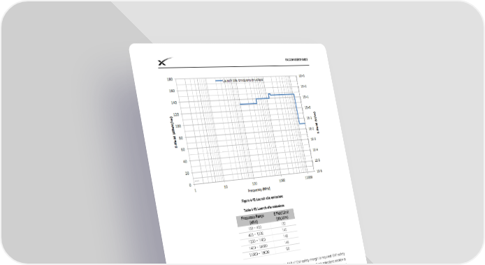FALCON USER’S GUIDE Figure 4-15: Launch site emissions Table 4-15: Launch site emissions Frequency Range E Field Limit (MHz) (dBμV/m) 100 – 400 132 400 – 1200 140 1200 – 1400 148 1400 – 11000 146 11000 – 18000 90 4.3.6.6 EMI SAFETY MARGIN To account for unexpected variation in hardware and environments, 6dB of EMI safety margin is required. EMI safety margin is typically expected to be included on the “victim” side of the source-victim analysis. Each emissions section in this guide specifies whether safety margin has been included in the envelope provided. When safety margin has not been included, it is expected that the relevant spacecraft susceptibility limit will include 6dB of EMI safety margin. 4.3.6.7 LIGHTNING PROTECTION SpaceX launch pads at CCAFS/KSC contain full lightning protection systems. The integration facilities and hangars are equipped with lightning grounding systems to protect personnel and hardware from lightning. The SLC-40 and LC-39A launch pads are equipped with overhead wire lightning protection systems. These systems are designed to: 1. Be a preferential path for lightning in order to prevent direct attachments to personnel and hardware in the protection zone. 2. Avoid side flash between the overhead wires and flight hardware and ground systems. 3. Minimize electromagnetic coupling to flight hardware and ground systems in order to protect sensitive electronics. © Space Exploration Technologies Corp. All rights reserved. 33