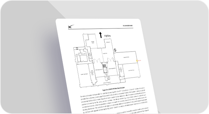 FALCON USER’S GUIDE Figure 8-4: CCAFS PPF West Bay floor plan Services and equipment provided for satellite processing within the PPF are outlined in Table 8-1. Additional space is provided for customer ground support equipment and operations personnel. A facility HVAC system maintains payload processing facility environments. SpaceX will continuously monitor relative humidity, temperature and cleanliness in the payload processing facility using particle counters. Cleanliness monitoring using witness plates is available as a nonstandard service. After encapsulation and prior to launch vehicle mate, SpaceX will verify purge media source and ducting cleanliness. The customer must supply any necessary cables and converters for its ground support equipment to interface with payload processing facility power. SpaceX can supply alternative power sources as a nonstandard service. The PPF is also designed to accommodate hazardous operations such as hypergolic propellant loading and ordnance installation. Any required fueling operations will be performed by customer personnel with assistance from SpaceX personnel. All personnel must use certified SCAPE suits, pass a physical and attend SCAPE training classes. All spacecraft processing operations within the PPF must be completed by L-10 days to allow for mating to the payload adapter, fairing encapsulation and transportation to the launch vehicle integration hangar in preparation for launch. Table 8-1: Services and equipment for payload processing CCAFS VAFB Clean room Dimensions No less than 29 m x 16.5 m floor size (95 ft No less than 29.2 m x 20.7 m floor size x 54 ft) (95.8 ft x 67.9 ft) Exterior door No less than 7.62 m high x 15.24 m wide No less than 6.01 m high x 6.01 m wide (25 ft x 50 ft) (20 ft x 20 ft) Temp/Clean See See Table 4-2 (PPF facility HVAC) Table 4-2 (PPF facility HVAC) © Space Exploration Technologies Corp. All rights reserved. 54
