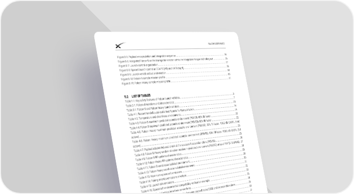 FALCON USER’S GUIDE Figure 8-5: Payload encapsulation and integration sequence ...................................................................................................... 56 Figure 8-6: Integrated Falcon 9 on the transporter-erector within the integration hangar and rolling out .......................... 56 Figure 8-7: Launch control organization ............................................................................................................................................ 57 Figure 8-8: SpaceX launch control at CCAFS (left) and VAFB (right) ........................................................................................... 58 Figure 8-9: Launch vehicle rollout and erection ............................................................................................................................... 58 Figure 8-10: Falcon 9 sample mission profile .................................................................................................................................. 60 Figure 8-11: Falcon Heavy sample mission profile ......................................................................................................................... 61 LIST OF TABLES Table 1-1: Key safety features of Falcon launch vehicles ................................................................................................................ 3 Table 2-1: Falcon dimensions and characteristics ............................................................................................................................ 7 Table 3-1: Falcon 9 and Falcon Heavy launch services ................................................................................................................. 10 Table 4-1: Recommended quasi-static load factors for transportation ...................................................................................... 14 Table 4-2: Temperature and cleanliness environments ................................................................................................................. 14 Table 4-3: Falcon 9 maximum predicted acoustic environment (P95/50), 60% fill-factor ...................................................... 20 Table 4-4: Falcon 9 maximum predicted acoustic environment (P95/50), 60% fill-factor ...................................................... 22 Table 4-5: Falcon Heavy maximum predicted acoustic environment (P95/50), 60% fill-factor, 135.2 dB OASPL (third octave) ...................................................................................................................................................................................................... 23 Table 4-6: Falcon Heavy maximum predicted acoustic environment (P95/50), 60% fill-factor, 135.6 dB OASPL (full octave) ...................................................................................................................................................................................................... 25 Table 4-7: Payload adapter-induced shock at the spacecraft separation plane (P95/50) ...................................................... 25 Table 4-8: Falcon 9/Heavy random vibration maximum predicted environment (P95/50) at top of PAF [5.13 GRMS] .... 27 Table 4-9: Falcon 9 RF systems characteristics .............................................................................................................................. 28 Table 4-10: Falcon Heavy RF systems characteristics .................................................................................................................. 28 Table 4-11: Falcon 9 worst-case radiated environment ................................................................................................................. 29 Table 4-12: Falcon Heavy worst-case radiated environment ........................................................................................................ 30 Table 4-13: Maximum spacecraft emissions ................................................................................................................................... 31 Table 4-14: Fairing avionics emissions envelope ............................................................................................................................ 32 Table 4-15: Launch site emissions ..................................................................................................................................................... 33 Table 4-16: Spacecraft environmental compatibility verification example ................................................................................ 35 Table 5-1: Payload electrical interface connectivity ........................................................................................................................ 38 Table 5-2: Maximum expected cable lengths between payload racks/EGSE and the separation plane .............................. 39 Table 7-1: Standard launch integration schedule ............................................................................................................................ 50 Table 7-2: Required documents and data for all payloads ............................................................................................................ 51 Table 7-3: Additional required documents and data for non-US persons and non-US government payloads .................... 51 Table 8-1: Services and equipment for payload processing .......................................................................................................... 54 Table 8-2: Launch control organization ............................................................................................................................................. 57 Table 8-3: Falcon 9 sample flight timeline—GTO mission ............................................................................................................. 62 Table 8-4: Falcon 9 sample flight timeline—LEO mission ........................