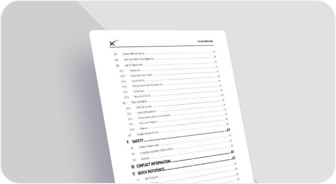 FALCON USER’S GUIDE Spacecraft Processing ..................................................................................................................................................... 53 Joint Operations and Integration ................................................................................................................................... 55 Launch Operations ............................................................................................................................................................ 57 8.5.1 Organization ......................................................................................................................................................................................57 8.5.2 Spacecraft Control Center ..............................................................................................................................................................57 8.5.3 Launch Control .................................................................................................................................................................................58 8.5.4 Rollout, Erection and Pad Operations .......................................................................................................................................... 58 8.5.5 Countdown ........................................................................................................................................................................................59 8.5.6 Recycle and Scrub ...........................................................................................................................................................................59 Flight Operations ............................................................................................................................................................... 59 8.6.1 Liftoff and Ascent ............................................................................................................................................................................59 8.6.2 Spacecraft Separation ....................................................................................................................................................................59 8.6.3 Contamination and Collision Avoidance ..................................................................................................................................... 59 8.6.4 Post Launch Reports .......................................................................................................................................................................59 8.6.5 Disposal .............................................................................................................................................................................................59 Sample Mission Profile .................................................................................................................................................... 60 9 SAFETY ................................................................................................................................63 Safety Requirements ........................................................................................................................................................ 63 Hazardous Systems and Operations ............................................................................................................................ 63 Waivers ................................................................................................................................................................................ 63 10 CONTACT INFORMATION .............................................................................................. 64 11 QUICK REFERENCE ..........................................................................................................65 List of Figures .................................................................................................................................................................... 65 List of Tables ...................................................................................................................................................................... 66 List of Acronyms ............................................................................................................................................................... 66 Change Log ........................................................................................................................................................................ 68 © Space Exploration Technologies Corp. All rights reserved. iv