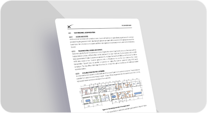 FALCON USER’S GUIDE 6.2.1 VAFB PERSONNEL ACCOMMODATIONS 6.2.1.1 ACCESS AND BADGES VAFB is a US Air Force base with controlled access. SpaceX will facilitate pre-approval, badging and access for customer personnel requiring access to VAFB. Once badged, customer personnel will have access to the appropriate areas of the launch base. Non-US persons are subject to additional pre-approval and escort requirements, which will be facilitated by SpaceX. 6.2.1.2 TRANSPORTATION, LODGING AND SERVICES Customers typically fly commercial transport to Los Angeles International Airport (LAX), rent cars at the airport, and find lodging between Lompoc and Santa Maria for the duration of their stay in California. The drive between LAX and VAFB takes approximately 3 hours. Customers occasionally fly into Santa Barbara Airport (SBA) as well; the drive from SBA to VAFB takes about an hour. Customer personnel who are US persons may use their own rental cars for on-base transportation. SpaceX does not provide transportation or lodging for customer personnel during VAFB launch campaigns. The area offers a full range of services; your mission manager can provide you with additional detailed recommendations. 6.2.1.3 AVAILABLE FACILITIES FOR CUSTOMERS As a standard service, SpaceX provides desk and office space (Figure 6-6) for customer personnel. These facilities are available from customer arrival through launch + 3 days. Offices are provided with US-standard power (120 V, 60 Hz), high-speed Internet service and standard office equipment. Figure 6-6: Vandenberg customer office space layout The pad customer room is located in a bunker below the launch pad and is used during pad operations. Figure 6-7 below shows the size and layout of this facility. © Space Exploration Technologies Corp. All rights reserved. 45