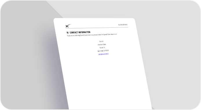 FALCON USER’S GUIDE 10 CONTACT INFORMATION If you are considering SpaceX launch services, please contact the SpaceX Sales department: SpaceX Attention: Sales Rocket Rd. Hawthorne, CA 90250 [email protected] © Space Exploration Technologies Corp. 64 SpaceX Proprietary and Competition-Sensitive Information.