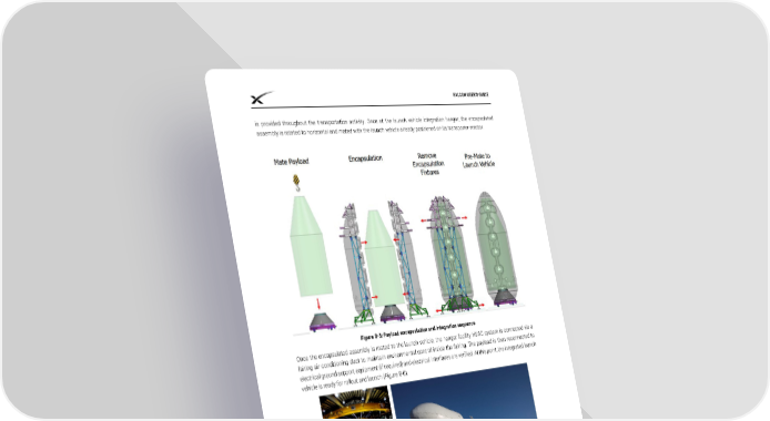 FALCON USER’S GUIDE is provided throughout the transportation activity. Once at the launch vehicle integration hangar, the encapsulated assembly is rotated to horizontal and mated with the launch vehicle already positioned on its transporter-erector. Figure 8-5: Payload encapsulation and integration sequence Once the encapsulated assembly is mated to the launch vehicle, the hangar facility HVAC system is connected via a fairing air conditioning duct to maintain environmental control inside the fairing. The payload is then reconnected to electrical ground support equipment (if required) and electrical interfaces are verified. At this point, the integrated launch vehicle is ready for rollout and launch (Figure 8-6). Figure 8-6: Integrated Falcon 9 on the transporter-erector within the integration hangar and rolling out © Space Exploration Technologies Corp. All rights reserved. 56