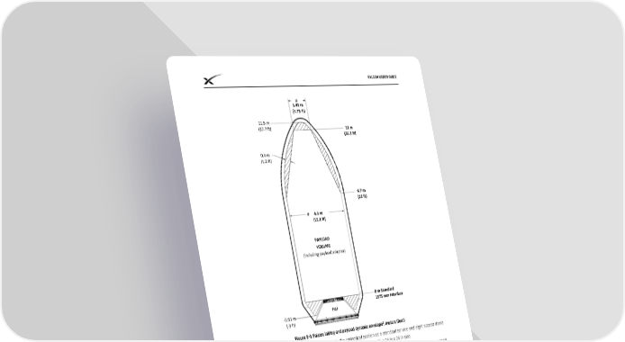 FALCON USER’S GUIDE 1.45 m (4.75 ft) 11.5 m (37.7 ft) 11 m (36.1 ft) 0.4 m (1.3 ft) 6.7 m (22 ft) 4.6 m (15.1 ft) PAYLOAD VOLUME (Including payload adapter) 0 m Standard 1575 mm Interface -0.91 m PAF (-3 ft) 2 Figure 5-1: Falcon fairing and payload dynamic envelope , meters (feet) The fairing can accommodate one access door in the cylindrical portion as a standard service and eight access doors as a non-standard service. The standard payload fairing door is circular, with a 24 in x 24 in size. A single through-fairing RF antenna (re-radiation) system is available as a standard service for use during payload antenna testing while on the launch pad. The service is provided for common command and telemetry frequencies. Contact SpaceX for further information on multiple re-radiation systems or non-standard frequencies. Through-fairing RF antenna (re-radiation) systems are not available for using during flight. SpaceX utilizes standard RF antennae locations on the SpaceX fairing and will work to clock the payload accordingly. Other than remove/install-before-flight items, all processing requiring access to the payload must be completed prior to fairing installation. In the event of a payload anomaly requiring customer access to the payload, the standard concept 2 Payload dynamic envelope (shown as “payload volume”) indicates the volume that the spacecraft is allowed to move within, without intrusion by the fairing due to its dynamic motions. © Space Exploration Technologies Corp. All rights reserved. 37