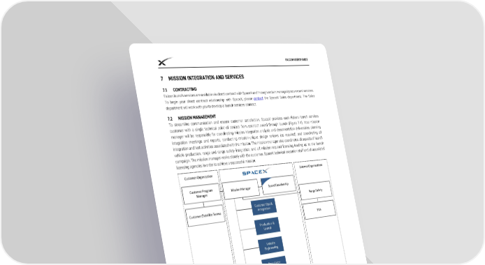 FALCON USER’S GUIDE 7 MISSION INTEGRATION AND SERVICES CONTRACTING Falcon launch services are available via direct contract with SpaceX and through certain managed procurement services. To begin your direct contract relationship with SpaceX, please contact the SpaceX Sales department. The Sales department will work with you to develop a launch services contract. MISSION MANAGEMENT To streamline communication and ensure customer satisfaction, SpaceX provides each Falcon launch services customer with a single technical point of contact from contract award through launch (Figure 7-1). Your mission manager will be responsible for coordinating mission integration analysis and documentation deliverables, planning integration meetings and reports, conducting mission-unique design reviews (as required) and coordinating all integration and test activities associated with the mission. The mission manager also coordinates all aspects of launch vehicle production, range and range safety integration, and all mission-required licensing leading up to the launch campaign. The mission manager works closely with the customer, SpaceX technical execution staff and all associated licensing agencies in order to achieve a successful mission. Customer Organization External Organizations Customer Program Mission Manager SpaceXLeadership Manager Range Safety Customer/Satellite Teams Customer Ops & Integration FAA Production & Launch Vehicle Engineering Propulsion Engineering Build & Flight Reliability Avionics Figure 7-1: Mission management organization The mission manager will work with the customer to create a spacecraft-to-launch vehicle interface control document (ICD)—the master document for a Falcon launch vehicle mission. Following signature approval of the ICD, SpaceX maintains configuration control of the document. © Space Exploration Technologies Corp. All rights reserved. 48