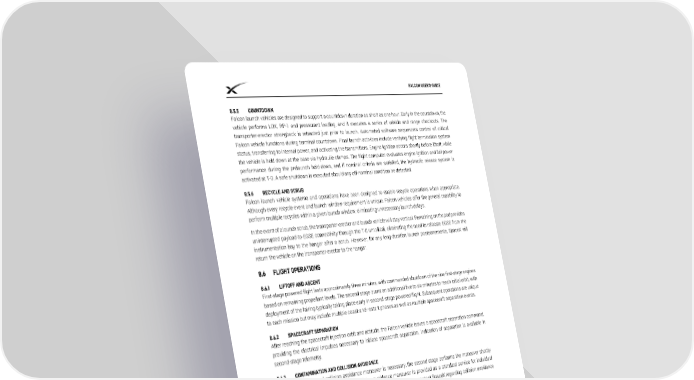 FALCON USER’S GUIDE 8.5.5 COUNTDOWN Falcon launch vehicles are designed to support a countdown duration as short as one hour. Early in the countdown, the vehicle performs LOX, RP-1 and pressurant loading, and it executes a series of vehicle and range checkouts. The transporter-erector strongback is retracted just prior to launch. Automated software sequencers control all critical Falcon vehicle functions during terminal countdown. Final launch activities include verifying flight termination system status, transferring to internal power, and activating the transmitters. Engine ignition occurs shortly before liftoff, while the vehicle is held down at the base via hydraulic clamps. The flight computer evaluates engine ignition and full-power performance during the prelaunch hold-down, and if nominal criteria are satisfied, the hydraulic release system is activated at T-0. A safe shutdown is executed should any off-nominal condition be detected. 8.5.6 RECYCLE AND SCRUB Falcon launch vehicle systems and operations have been designed to enable recycle operations when appropriate. Although every recycle event and launch window requirement is unique, Falcon vehicles offer the general capability to perform multiple recycles within a given launch window, eliminating unnecessary launch delays. In the event of a launch scrub, the transporter-erector and launch vehicle will stay vertical. Remaining on the pad provides uninterrupted payload-to-EGSE connectivity through the T-0 umbilical, eliminating the need to relocate EGSE from the instrumentation bay to the hangar after a scrub. However, for any long-duration launch postponements, SpaceX will return the vehicle on the transporter-erector to the hangar. FLIGHT OPERATIONS 8.6.1 LIFTOFF AND ASCENT First-stage powered flight lasts approximately three minutes, with commanded shutdown of the nine first-stage engines based on remaining propellant levels. The second stage burns an additional five to six minutes to reach initial orbit, with deployment of the fairing typically taking place early in second-stage powered flight. Subsequent operations are unique to each mission but may include multiple coast-and-restart phases as well as multiple spacecraft separation events. 8.6.2 SPACECRAFT SEPARATION After reaching the spacecraft injection orbit and attitude, the Falcon vehicle issues a spacecraft separation command, providing the electrical impulses necessary to initiate spacecraft separation. Indication of separation is available in second-stage telemetry. 8.6.3 CONTAMINATION AND COLLISION AVOIDANCE If a contamination and collision avoidance maneuver is necessary, the second stage performs the maneuver shortly after separation. A contamination and collision avoidance maneuver is provided as a standard service for individual primary payloads. For multi-manifested and secondary payloads, please contact SpaceX regarding collision avoidance requirements. 8.6.4 POST LAUNCH REPORTS SpaceX will provide a quick-look orbit injection report to the customer shortly after spacecraft separation, including a best-estimate spacecraft separation state vector. A final, detailed post-flight report is provided within eight weeks of launch. 8.6.5 DISPOSAL SpaceX makes every effort to mitigate space debris by responsibly passivating and disposing of hardware on orbit. Customer-specific requirements on disposal may impose modest reductions to the performance specifications indicated in Section 3.2. © Space Exploration Technologies Corp. All rights reserved. 59
