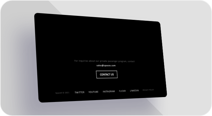 For inquiries about our private passenger program, contact sales@spacex.com CONTACT US SpaceX © 2021 TWITTER YOUTUBE INSTAGRAM FLICKR LINKEDIN PRIVACY POLICY