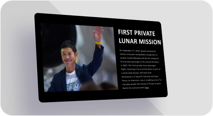 FIRST PRIVATE LUNAR MISSION On September 17, 2018, SpaceX announced fashion innovator and globally recognized art curator Yusaku Maezawa will be the company’s first private passenger to fly around the Moon in 2023. This first private lunar passenger flight, featuring a fly-by of the Moon as part of a week-long mission, will help fund development of SpaceX’s Starship and Super Heavy, an important step in enabling access for everyday people who dream of flying to space. Watch the announcement here.