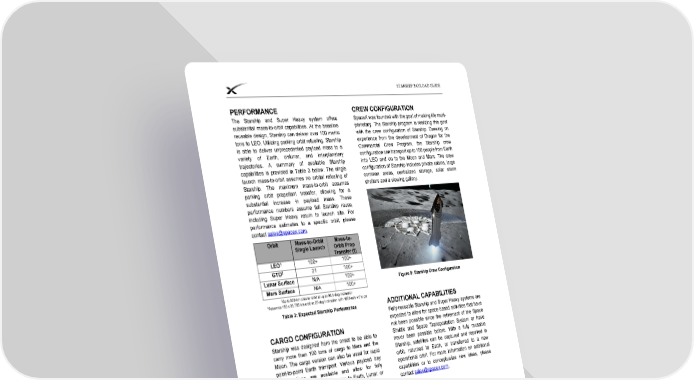 STARSHIP PAYLOAD GUIDE PERFORMANCE CREW CONFIGURATION The Starship and Super Heavy system offers SpaceX was founded with the goal of making life multi- substantial mass-to-orbit capabilities. At the baseline planetary. The Starship program is realizing this goal reusable design, Starship can deliver over 100 metric with the crew configuration of Starship. Drawing on tons to LEO. Utilizing parking orbit refueling, Starship experience from the development of Dragon for the is able to deliver unprecedented payload mass to a Commercial Crew Program, the Starship crew variety of Earth, cislunar, and interplanetary configuration can transport up to 100 people from Earth trajectories. A summary of available Starship into LEO and on to the Moon and Mars. The crew capabilities is provided in Table 3 below. The single configuration of Starship includes private cabins, large launch mass-to-orbit assumes no orbital refueling of common areas, centralized storage, solar storm Starship. The maximum mass-to-orbit assumes shelters and a viewing gallery. parking orbit propellant transfer, allowing for a substantial increase in payload mass. These performance numbers assume full Starship reuse, including Super Heavy return to launch site. For performance estimates to a specific orbit, please contact [email protected]. Orbit Mass-to-Orbit Mass-to- Single Launch Orbit Prop Transfer (t) LEO1 100+ 100+ GTO2 21 100+ Lunar Surface N/A 100+ Figure 8: Starship Crew Configuration Mars Surface N/A 100+ 1 Up to 500-km circular orbit at up to 98.9-deg inclination 2Assumes 185 x 35,786 km orbit at 27-deg inclination with 1800 m/s V to go Table 3: Expected Starship Performance ADDITIONAL CAPABILITIES Fully-reusable Starship and Super Heavy systems are expected to allow for space-based activities that have CARGO CONFIGURATION not been possible since the retirement of the Space Starship was designed from the onset to be able to Shuttle and Space Transportation System or have carry more than 100 tons of cargo to Mars and the never been possible before. With a fully reusable Moon. The cargo version can also be used for rapid Starship, satellites can be captured and repaired in point-to-point Earth transport. Various payload bay orbit, returned to Earth, or transferred to a new configurations are available and allow for fully operational orbit. For more information on additional autonomous deployment of cargo to Earth, Lunar, or capabilities or to conceptualize new ideas, please Martian surfaces with one example shown in Figure 7. contact [email protected]. Figure 7: Cargo Starship on Lunar Surface © Space Exploration Technologies Corp. All rights reserved. 5
