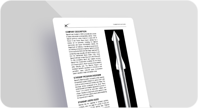STARSHIP PAYLOAD GUIDE COMPANY DESCRIPTION SpaceX was founded in 2002 to revolutionize access to space and enable a multi-planetary society. Today, SpaceX performs routine missions to space with its Falcon 9 and Falcon Heavy launch vehicles for a diverse set of customers, including the National Aeronautics and Space Administration (NASA), the Department of Defense, international governments, and leading commercial companies. SpaceX provides further support to NASA with the Dragon spacecraft by conducting cargo resupply and return missions to and from the International Space Station (ISS). Soon, SpaceX will begin transporting crew to the ISS as well. To offer competitive launch and resupply services, SpaceX has incorporated reusability into the Falcon and Dragon systems, which improves vehicle reliability while reducing cost. The Starship Program now leverages SpaceX’s experience to introduce a next- generation, super heavy-lift space transportation system capable of rapid and reliable reuse. STARSHIP PROGRAM OVERVIEW SpaceX’s Starship system represents a fully reusable transportation system designed to service Earth orbit needs as well as missions to the Moon and Mars. This two-stage vehicle—composed of the Super Heavy rocket (booster) and Starship (spacecraft) as shown in Figure 1—is powered by sub-cooled methane and oxygen. Starship is designed to evolve rapidly to meet near term and future customer needs while maintaining the highest level of reliability. STARSHIP USERS GUIDE Starship has the capability to transport satellites, payloads, crew, and cargo to a variety of orbits and Earth, Lunar, or Martian landing sites. Potential Starship customers can use this guide as a resource for preliminary payload accommodations information. This is the initial release of the Starship Users Guide and it will be updated frequently in response to customer feedback. PAYLOAD CONFIGURATIONS Starship crew and uncrewed configurations are shown in Figure 2. The uncrewed Starship allows for the transport of satellites, large observatories, cargo, refueling tanks or other unmanned assets. Subsequent sections provide an overview of the preliminary volume and mechanical interfaces available; preliminary Figure 1: Starship and Super Heavy payload environments expected; and the preliminary mass-to-orbit capabilities of Starship. Please contact [email protected] to evaluate how Starship can meet your unique needs. © Space Exploration Technologies Corp. All rights reserved. 1